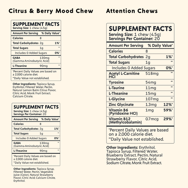Attention Chews are formulated with L-Carnitine, Tyrosine & L-Taurine to get you into a flow state for hours of focused productivity. Mood Chews contain GABA and L-Theanine to helps the mind reach a calm, concentrated state.
