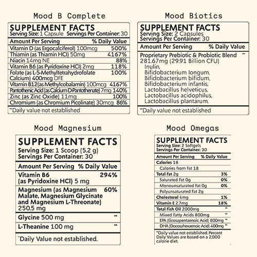 Mood B Complete: 9 essential vitamins and minerals your brain needs to optimize your mood. Helps your brain become more capable to synthesize serotonin.