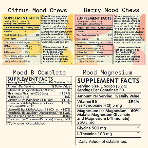 Get a full 30-day supply including: 1 jar of Mood Biotics, 1 jar of Mood Magnesium & 2 tins of Mood Chews.