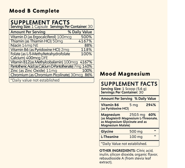 Mood B Complete is includes methylated b-vitamins for immediate effect and to improve over 100 neural functions. Mood Magnesium includes Magnesium L-Threonate, Magnesium Glycinate, and Magnesium Malate for sleep, stress support, and to increase relaxation.