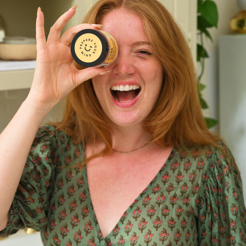 • Open jar of PYM Mood Magnesium dietary supplement with a black lid on a night stand, next to a glass with a green straw and a white alarm clock in the background. The jar label reads: "PYM, PREPARE YOUR MIND, MOOD MAGNESIUM, DIETARY SUPPLEMENT, YUZU CITRUS, AMINO-INFUSED MAGNESIUM TO SUPPORT STRESS, COGNITION & SLEEP, 500 MG GLYCINE, 5 MG B6, V VEGAN."