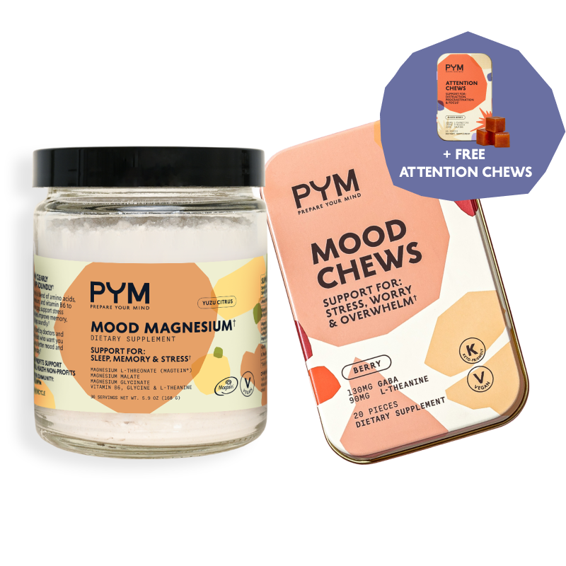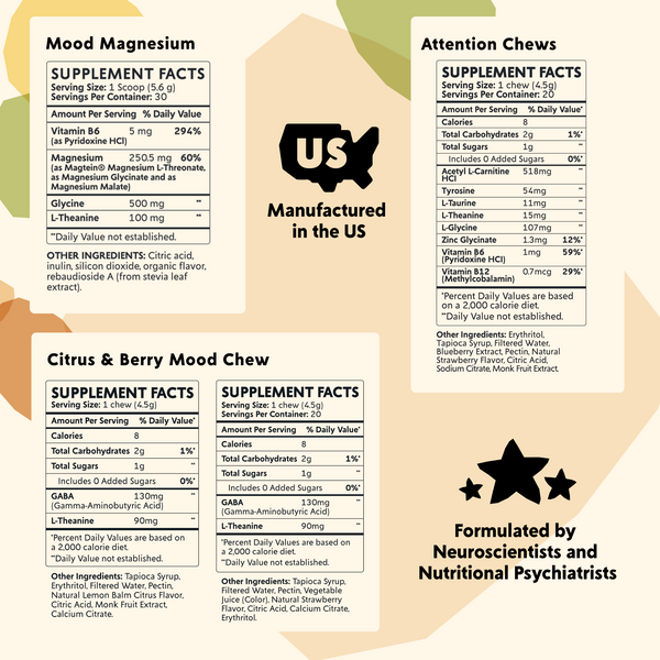 Mood Magnesium, Mood Chews (Berry or Citrus), plus Attention Chews as a free gift.